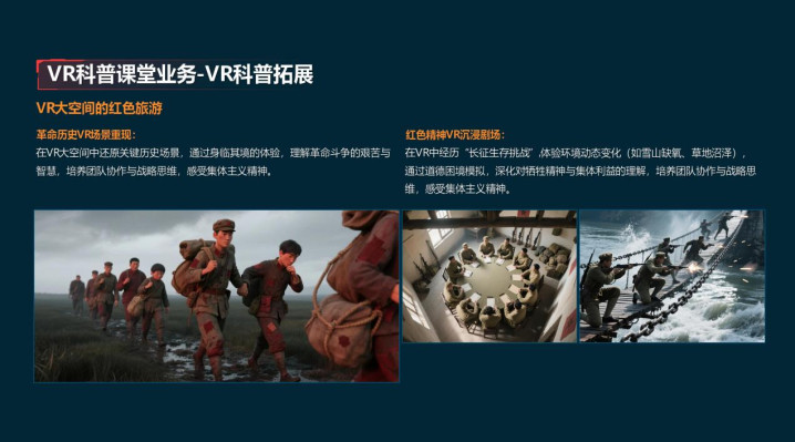 其中的VR是带上头盔眼镜后,完全进入了电脑生成的“全封闭、全模拟的另一个三维立体空间”,并且可以进行交互式的互动,应用场景可以用于影视、游戏、VR影院、虚拟演唱会、虚拟景区、数字博物馆、古迹复原、VR实训、安全演练、职业培训、VR看房、虚拟装修,还可以进行手术模拟、心理治疗、康复训练。也可以进行爱国主义教育和军事活动体验等等。