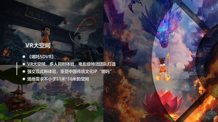 另一个项目是大空间强交互式《哪吒5DVR》体验,这个内容更适合孩子们,戴上设备的瞬间,你不再是观众,而是闯入哪吒世界的亲历者。风火轮在脚下呼啸生风,混天绫在眼前翻卷飞舞,每一次挥拳、每一步奔跑都能实时触发剧情,超强交互让你亲手操控神话。